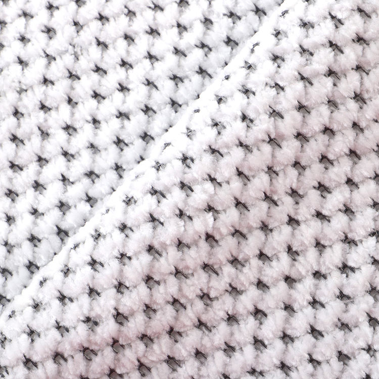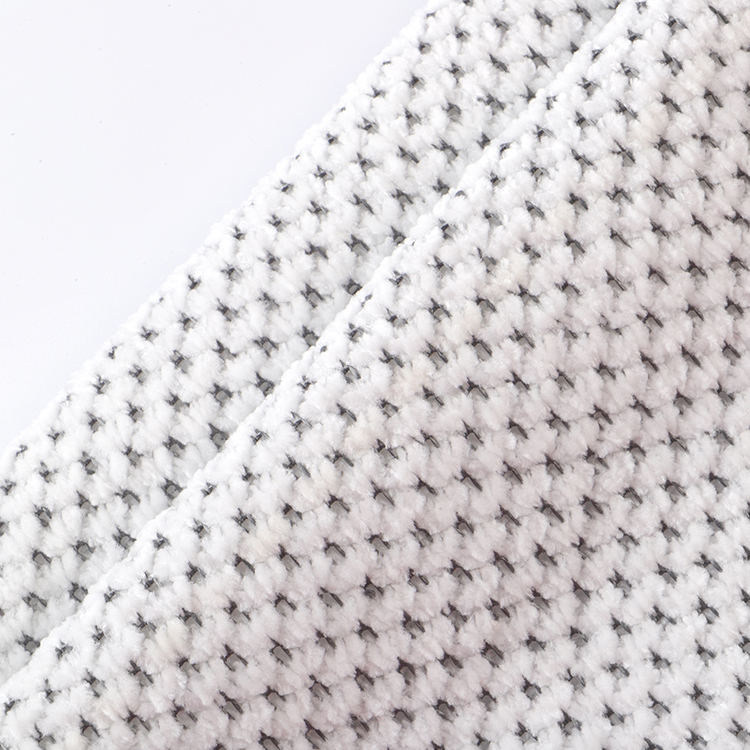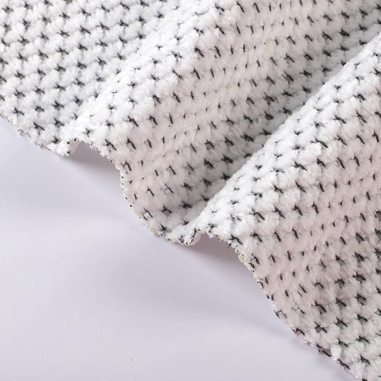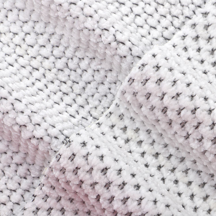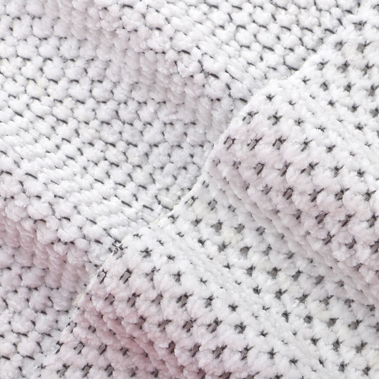 Chenille A# stoff har en høy haughøyde på 1 mm, noe som bidrar til dets elegante og sofistikerte utseende mens den er lett å rengjøre og vedlikeholde. Den strikkede teknikken som brukes i sin produksjon forbedrer stoffets styrke og lang levetid, noe som gjør det til et ideelt valg for tepper og tepper.