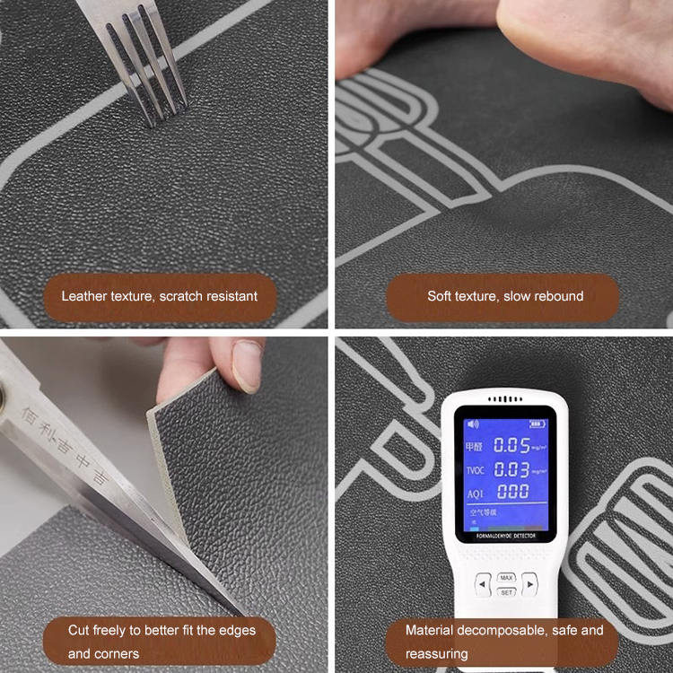 Tilgjengelig i forskjellige størrelser, inkludert 40*60 cm, 40*120 cm, 50*80cm, 50*120cm, 50*150 cm, 60*90cm og 60*160 cm, eller tilpasset dine behov, er matten laget av premium PU -lær. Dette materialet sikrer ikke bare et elegant, moderne utseende, men har også en betydelig vekt på 2300 gsm, noe som gjør det usedvanlig solid og behagelig. Med en tykkelse på 4mm gir den rikelig demping under føttene mens du opprettholder en slank profil som passer sømløst inn i enhver dekor.