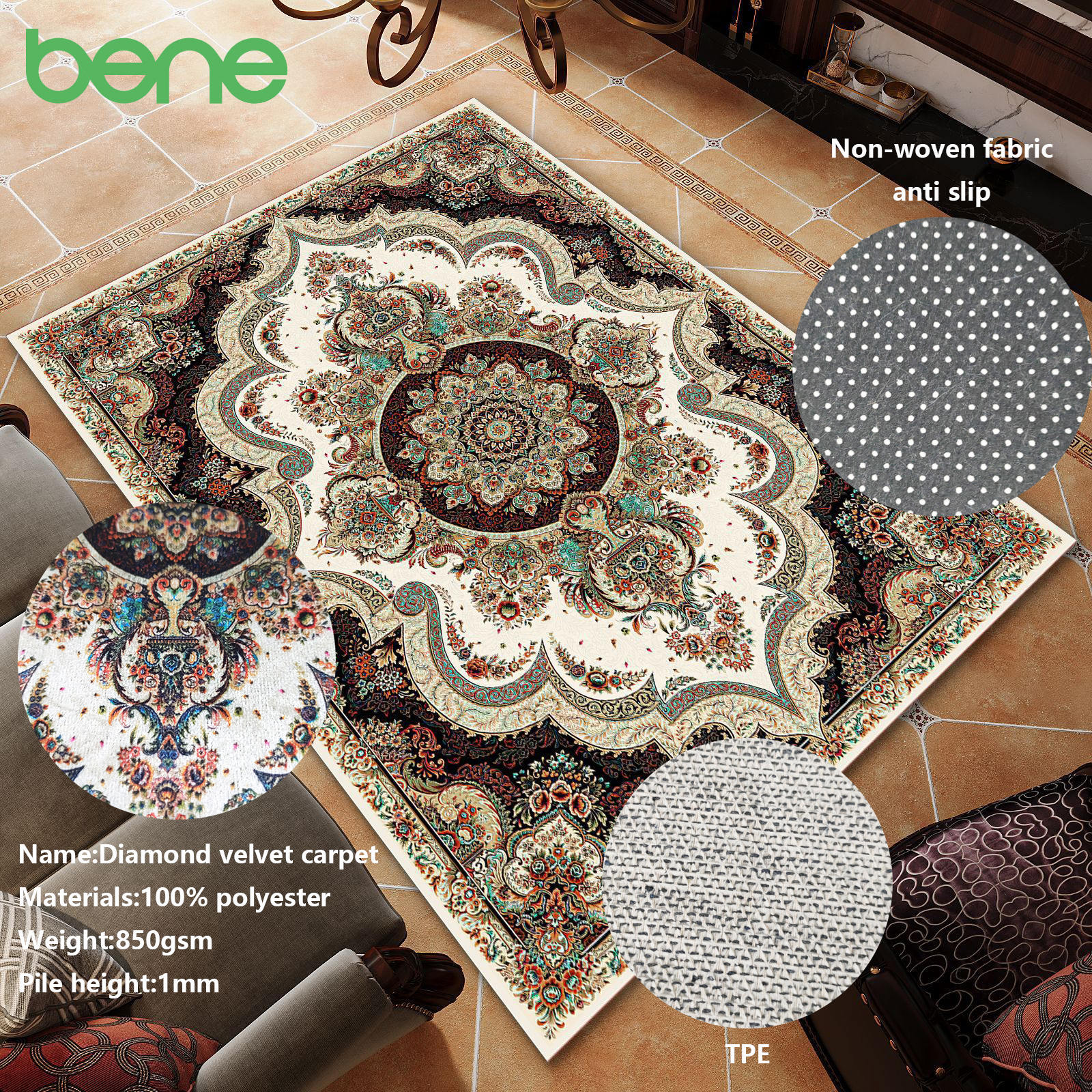 Vårt firma spesialiserer seg på tepper, teppestoffer og ferdige produkter. Ved å kombinere bunn og overflate, bryter det den tradisjonelle produksjonsmodus for høye produksjonskostnader og lav effektivitet i teppeindustrien, noe som gjør teppeproduksjonen enklere og mer effektiv. Bene har sine egne veving, farging/utskriftsfabrikker og ferdige teppeforedlingsfabrikker, slik at vi kan kontrollere hele produksjonskjeden, holde god kvalitet og ledetid. Med et team på over 20 stoffingeniører utvikler vi nye teppestoffer hvert kvartal basert på markedstrender og kan også tilby tilpassede tjenester i henhold til våre kundekrav. Våre tepper og tepper er egnet for forskjellige scenarier, inkludert stuer, soverom, bad, kjøkken, innganger og avkjørsler og mer. Vi er stolte av å tilby produkter av høy kvalitet og utmerket kundeservice, og målet vårt er å bli et ledende teppe- og teppeprodusent i Kina og til og med globalt. Det kan vi også engros Diamant fløyel bønnematte i bulk. Vi har eksport over hele verden._00.jpg)
