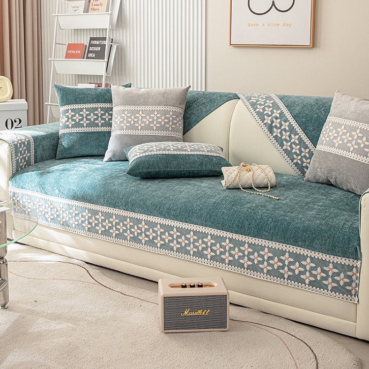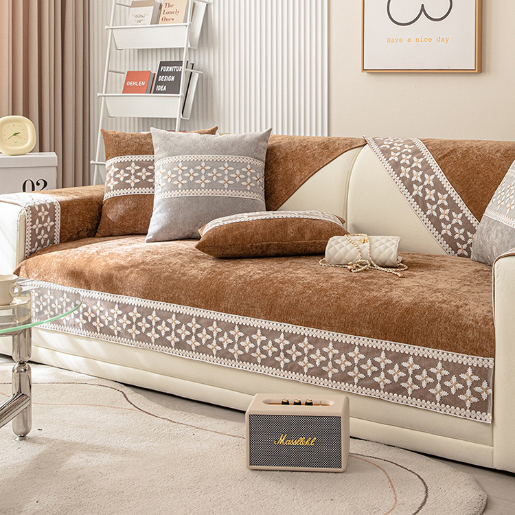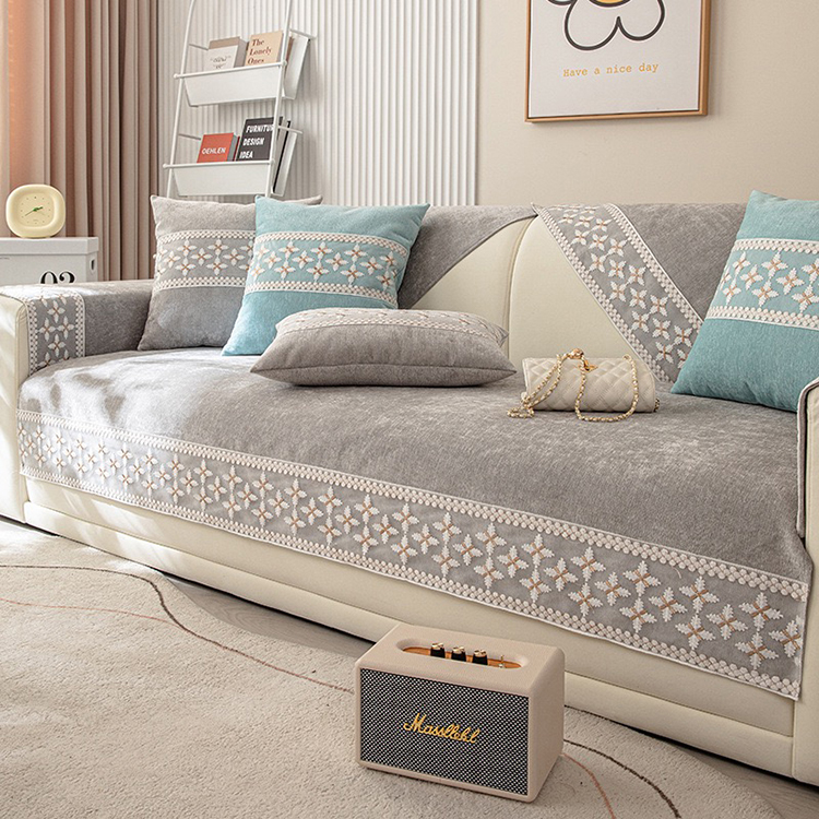 Omslaget har en bundet konstruksjon for ekstra motstandskraft og lang levetid. Støtten er utstyrt med en kombinasjon av tricot og anti-skli plastprikker, og sikrer at dekselet holder seg sikkert på plass, selv med hyppig bruk. Mønsteret for ensfarget farge forbedrer den klassiske appellen, mens det broderte Chenille -stoffet gir et snev av raffinement.